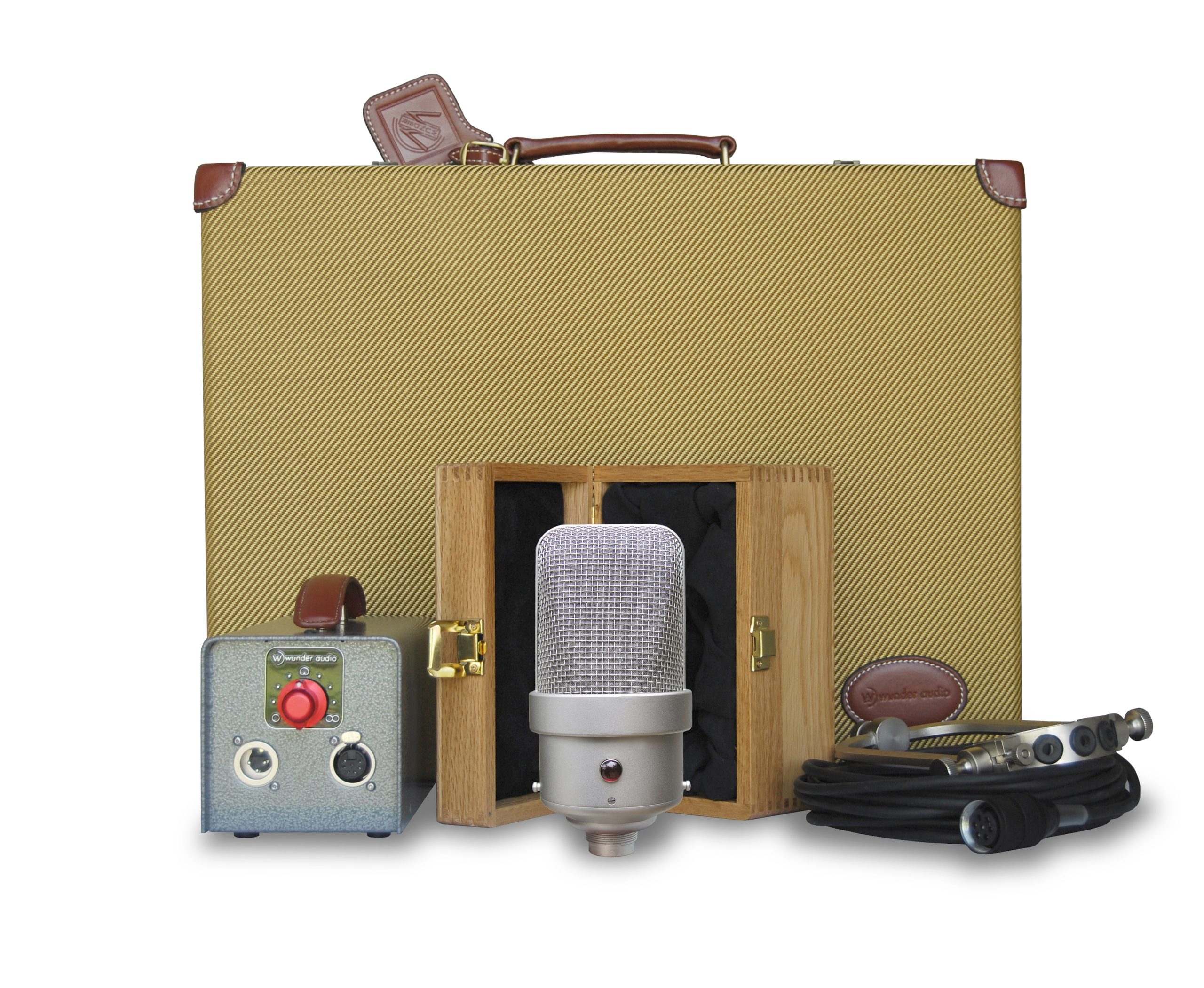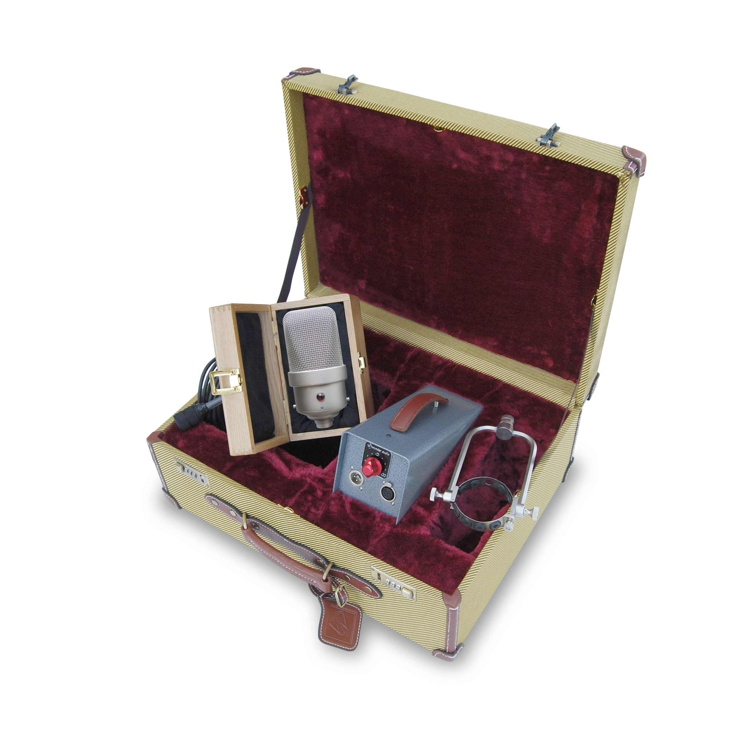 Your Wunder Audio CM49 S is nestled in velvet and softly secured in place in a foam-lined quarter sawn oak box that is clasped and hinged. This box then is safely encased in a precision velvet-lined thick foam tweed case that also holds your PSU, your improved one-piece newly designed yoke mount, and your cables.