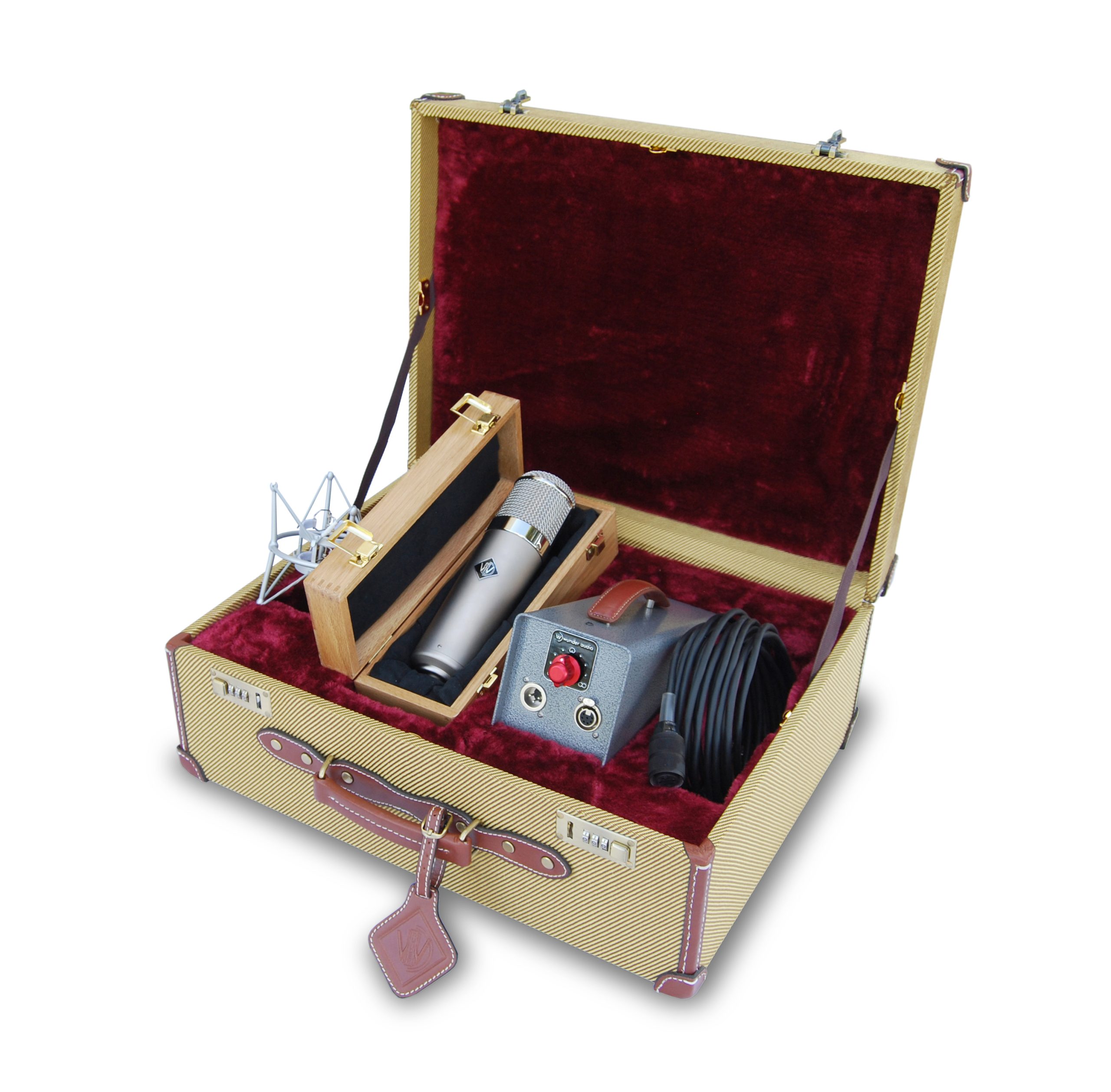 Your Wunder Audio CM7 GS is nestled in velvet and softly secured in place in a foam-lined quarter sawn oak box that is clasped and hinged. This box then is safely encased in a precision velvet-lined thick foam tweed case that also holds your PSU, your shock mount, and your cables. The tweed carrying case is a work of art in itself; it uses the same Fender tweed found in a vintage Fender guitar case which amplifies the vintage period of the vintage-style CM7 GS microphone, and it is trimmed with top grain leather and fine stitching. The CM7 GS case has a strong leather handle and combination lock to keep your mic secure. This case can be sold separately.